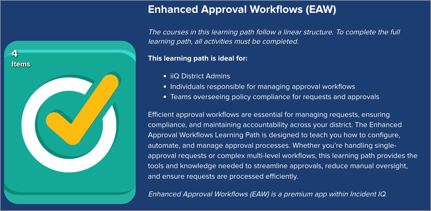 We’re thrilled to announce the launch of our brand-new Enhanced Approval Workflow (EAW) Learning Path in the Incident IQ Academy! These courses are designed to provide you with everything you need to know about configuring and managing approval workflows within your district’s iiQ system using the EAW app. Whether you're new to EAW or looking to refine your existing processes, this learning path will help you streamline approvals, increase transparency, and ensure district policies are consistently followed.
