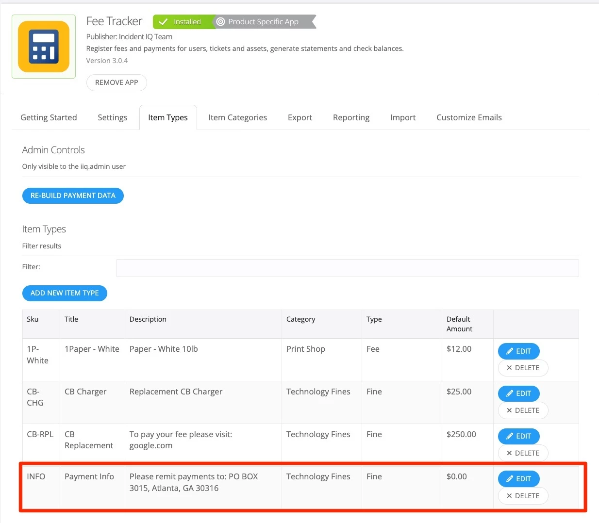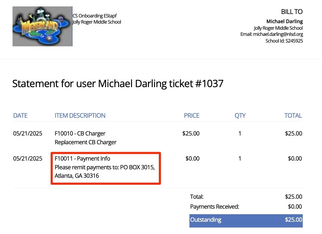 Printable Statements - Districts often print statements and give them to the student or send them through the snail mail. If this is your preferred method you might need a way to let people know how to pay the statement. A $0 item with instructions could be a way to give the information needed. Setup within the Fee Tracker app looks like this: