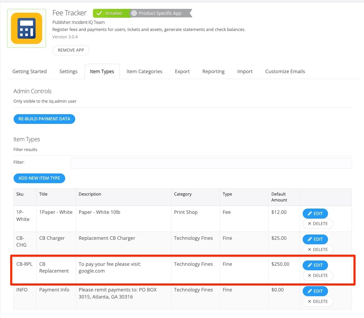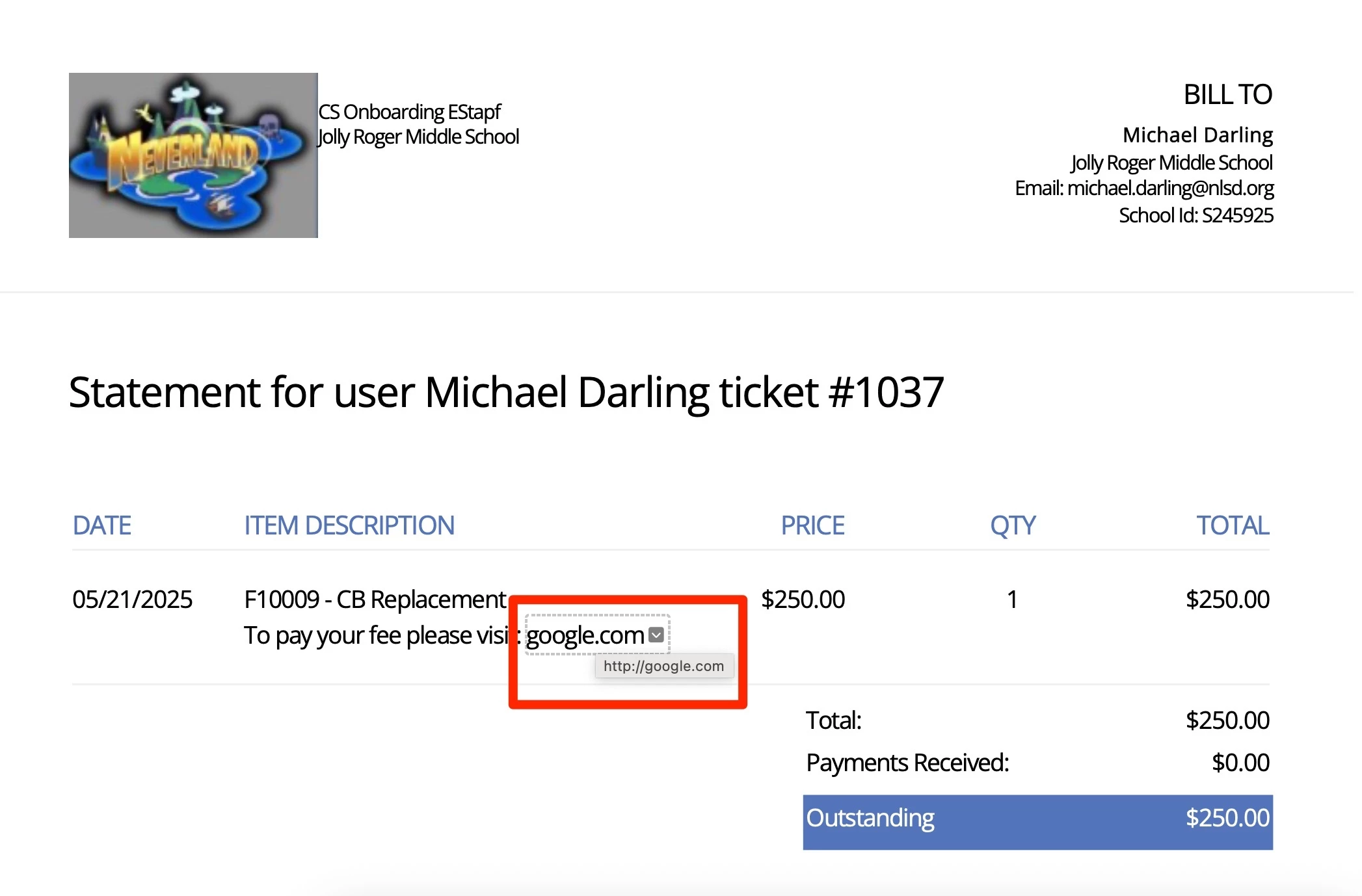 Emailed Statements - This was the way my district got fine information to parent/guardians and our payment processing app didn’t integrate with iiQ. My solution was to utilize the information in the item description (of every item - so no matter which item is on the invoice you have the needed information). Setup within Fee Tracker looks like this:
