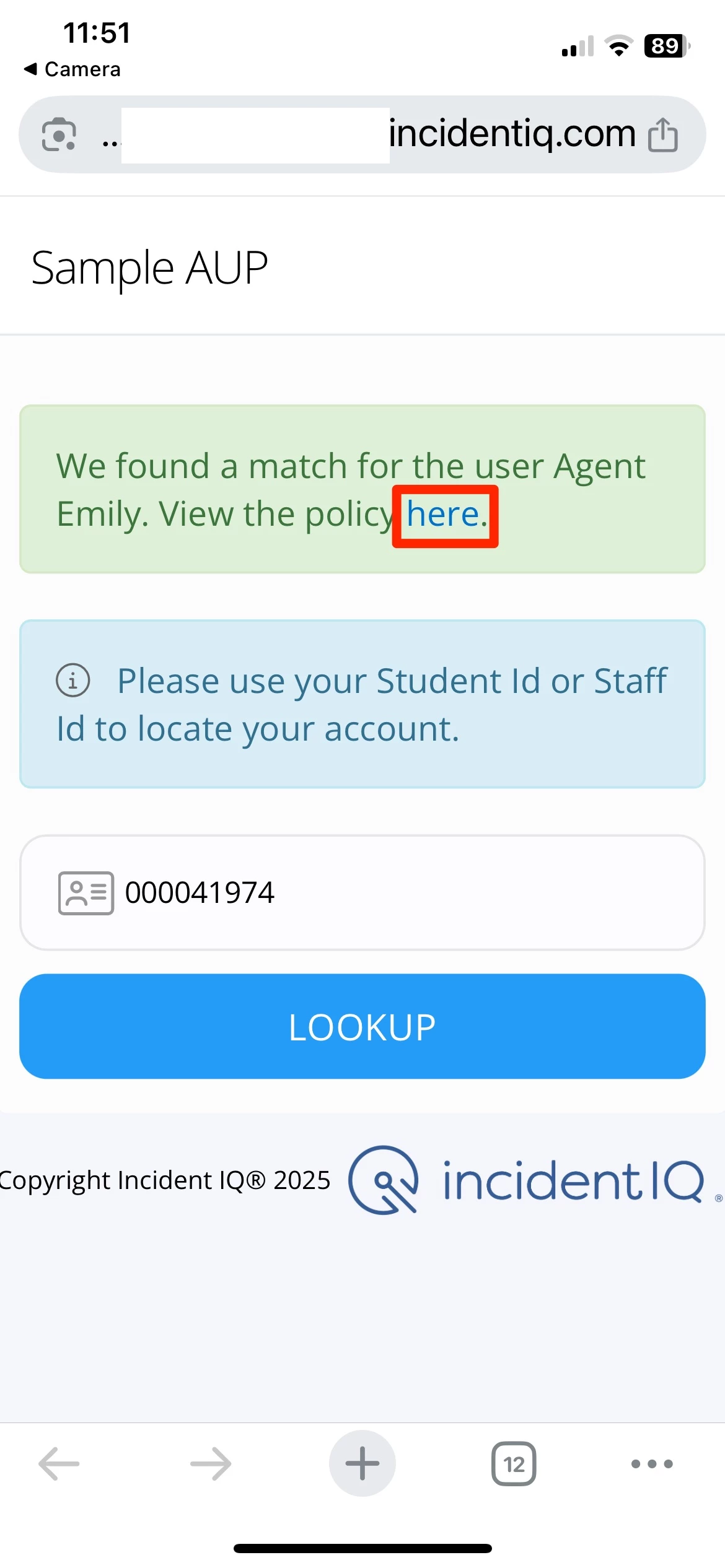 Type in the student or employee ID number and click ‘Lookup’: