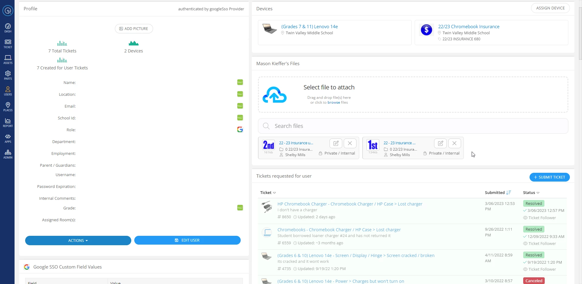 We have the insurance cover the student, rather than the device, in the event the student accidentally breaks a loaned Chromebook, or another students Chromebook. The Insurance Asset then shows as assigned to the student who paid.