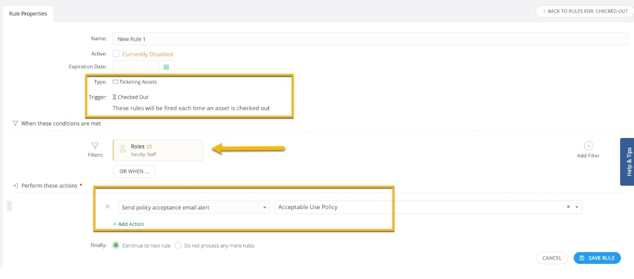 In the example above, when a new device is assigned or checked out to a user in the role of “faculty, staff” the policy “Acceptable Use Policy” will be sent to the user.