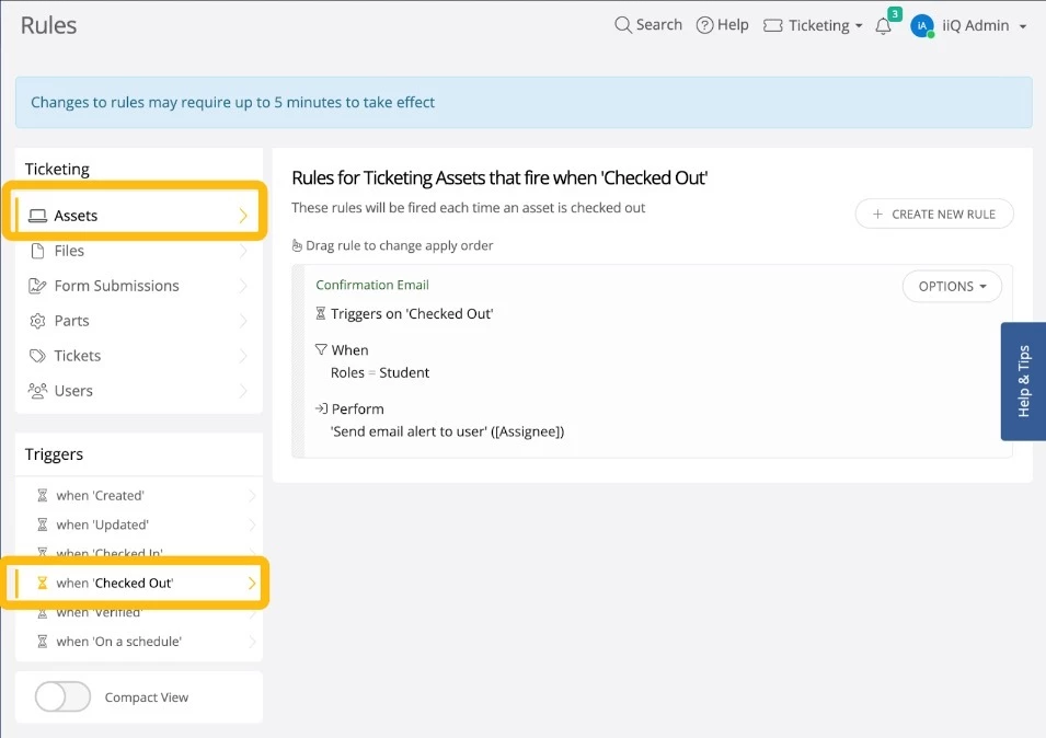 Within the rules engine, start creating the rule under Asset Select; the trigger is “When checked out.”