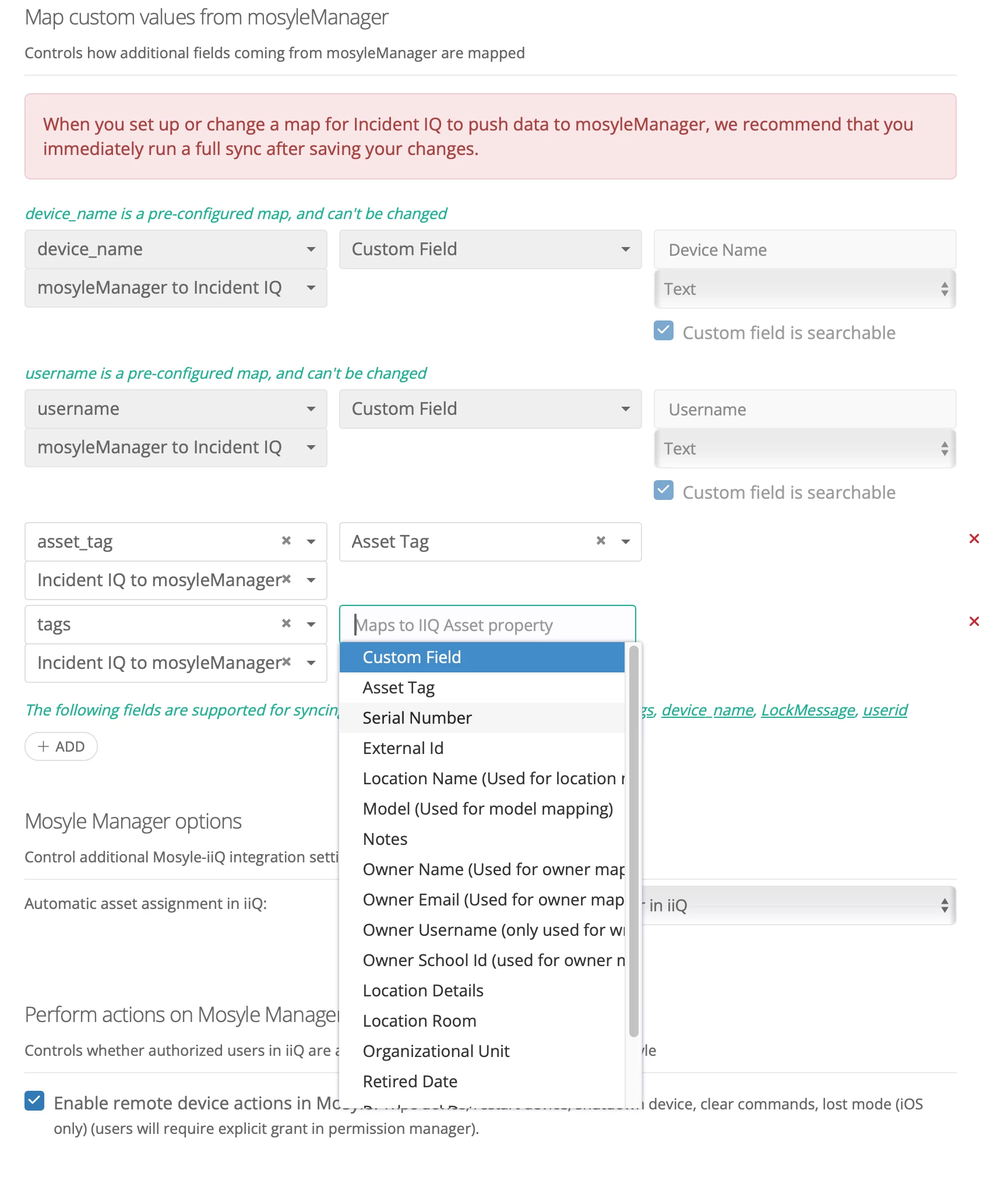 I am hoping for a way to sync device status from IIQ to Mosyle so we know when a device has been damaged or replaced. As Mosyle doesn’t have an inbuilt “Device status” attribute and IIQ supports syncing back tags, I was hoping to just sync IIQ’s status to Mosyle as a device tag; unfortunately, device status isn’t an option to sync as a tag.