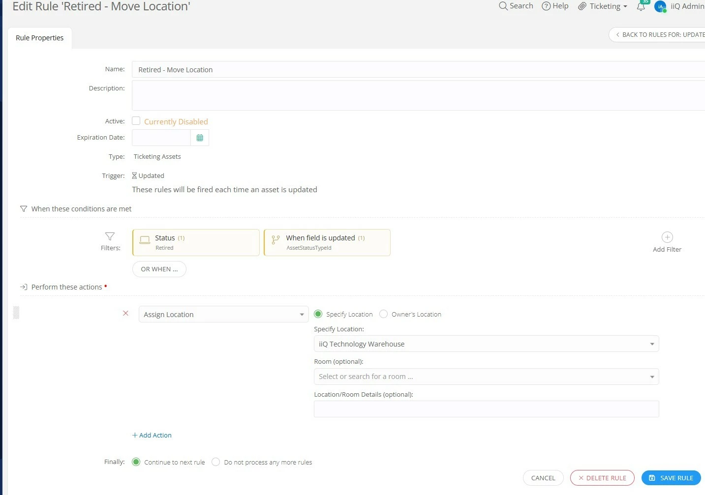 Looking to build a rule that deprovisions a chromebook and moves locations if status changed to Retired (or a custom status). Or deprovisions a chromebook is moved to a specific location and status updates to Retired.
