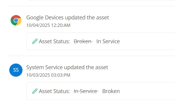 I have a rule when a device has a ticket submitted for a ‘broken’ issue, the device status is changed to ‘Broken’. However, the day after, the device status is changed back to ‘In Service’. Google Devices is doing it: