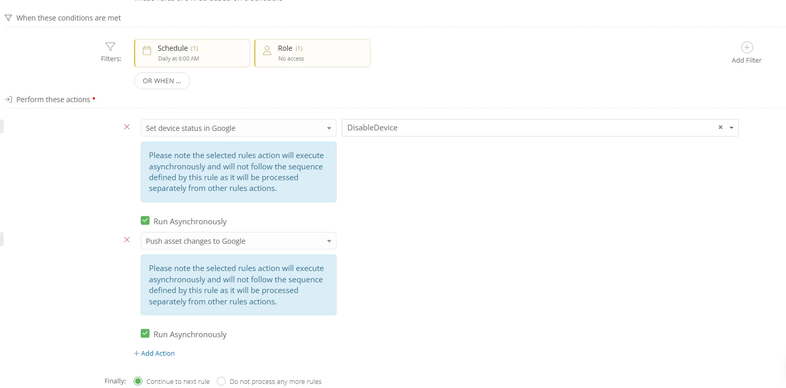 Then use these filters: Schedule(when you want the rule to rune) and Role(No Access) and the Model of the Devices you want disabled. Use the actions Set Device Status in Google(Disable Device) and Push Asset Changes to Google.