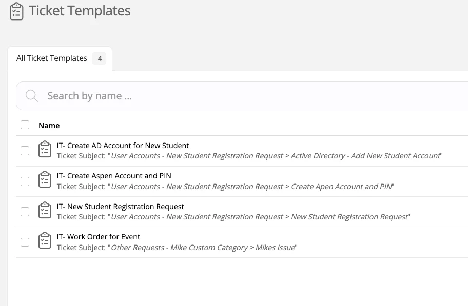 As districts use multiple Incident IQ modules—IT, Facilities, HR, etc.—ticket templates can become hard to distinguish. Adding a simple prefix to each template name (e.g., IT –, Facilities –) keeps everything organized and easy to manage.