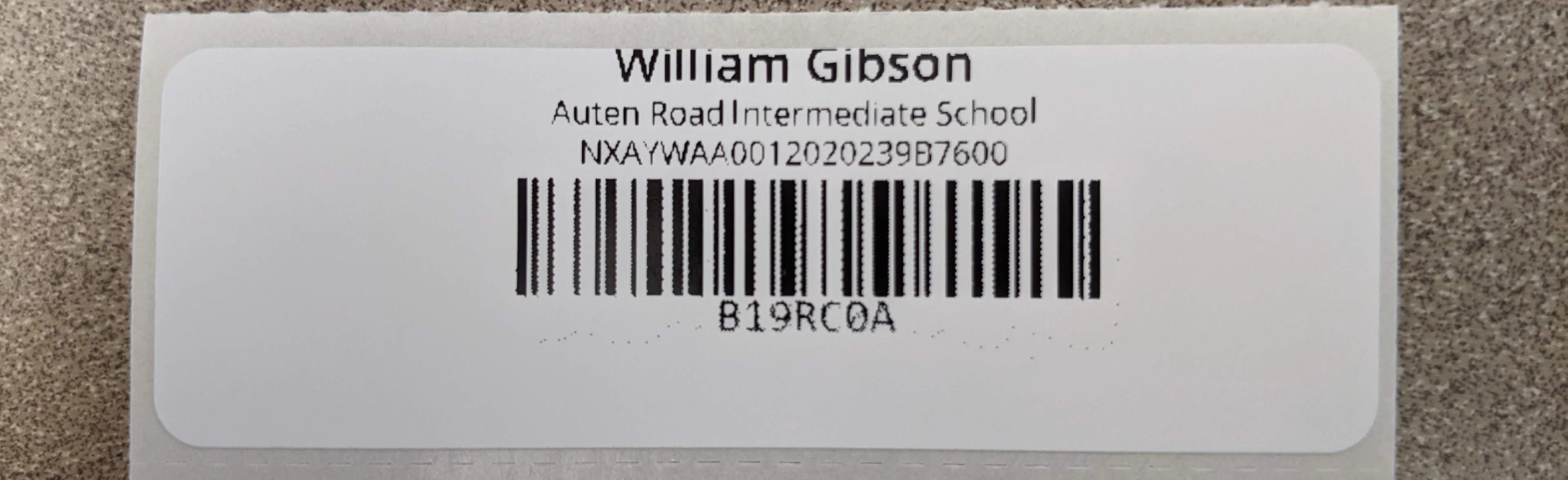 Dymo 450 with 1-1/8" x 3-1/2" labels. The labels are a little too big for us and attract the attention of our “label pickers”. The labels we use are also not tamper evident or security labels. The HP MK11 G9 chromebooks don’t have a smooth surface so the labels don’t adhere well.