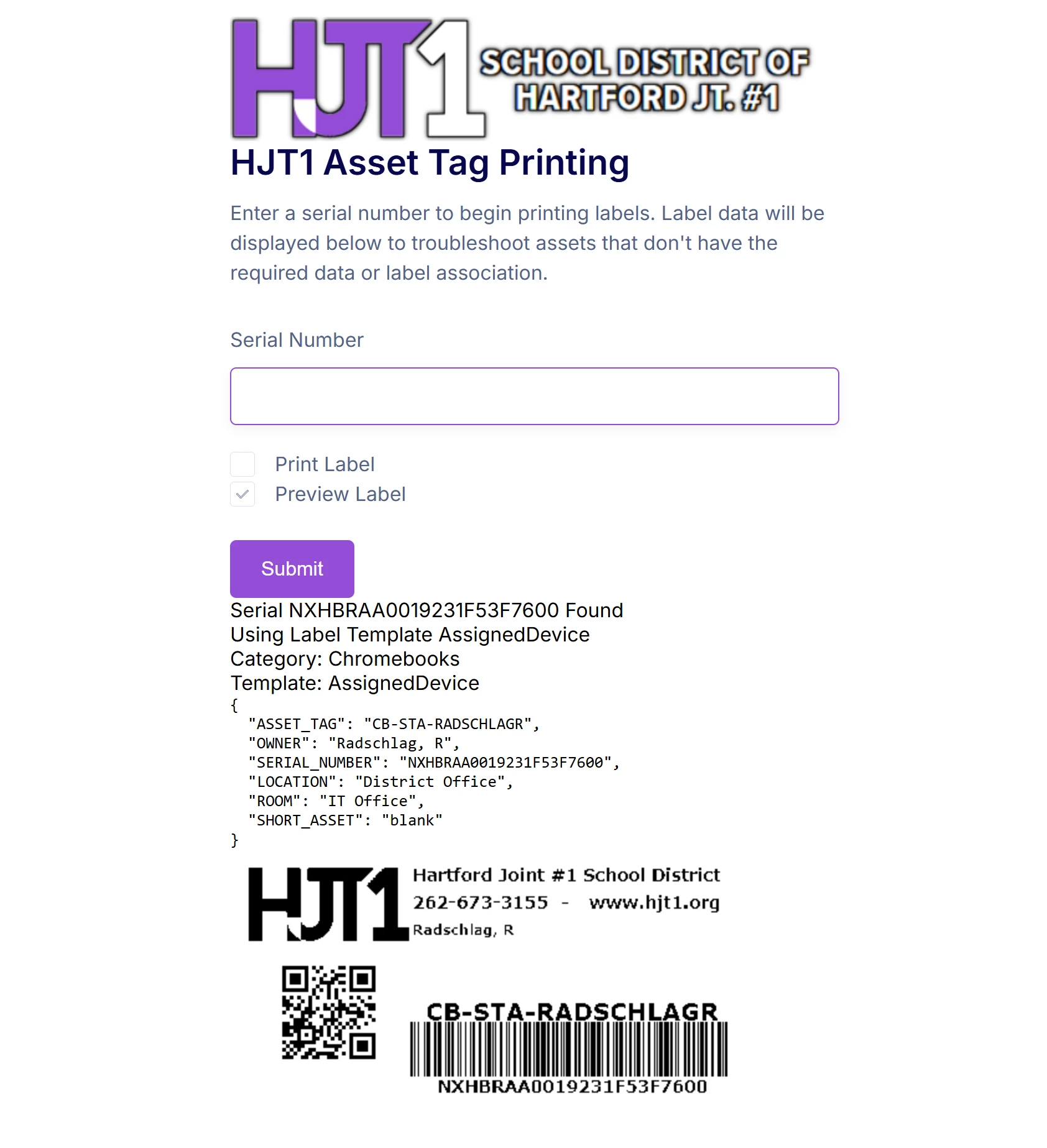 - queries the IIQ API with a serial number to get the necessary fields (owner, room, building, etc)