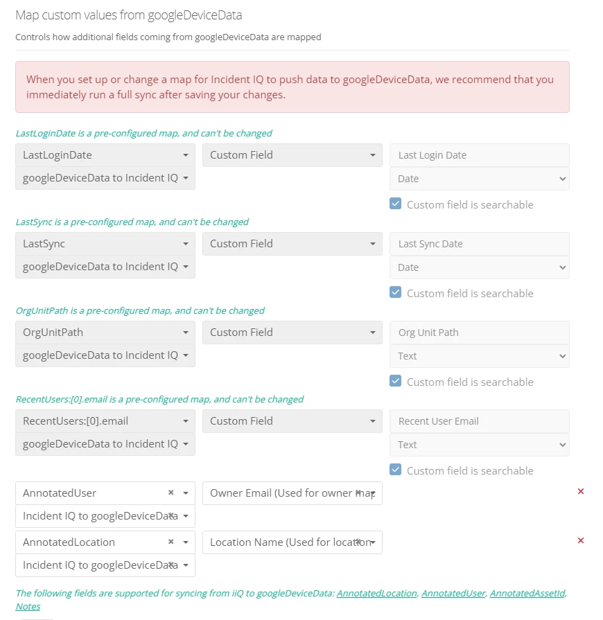 In the Google devices app, under the General settings, we have two custom fields added. AnnotatedUser is the user email and the AnnotatedLocation matches the students building.