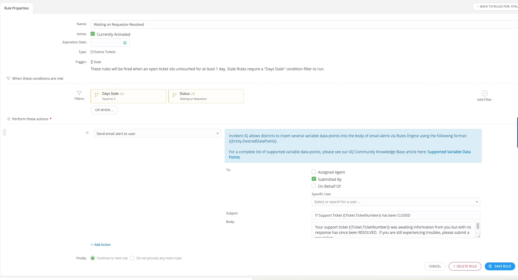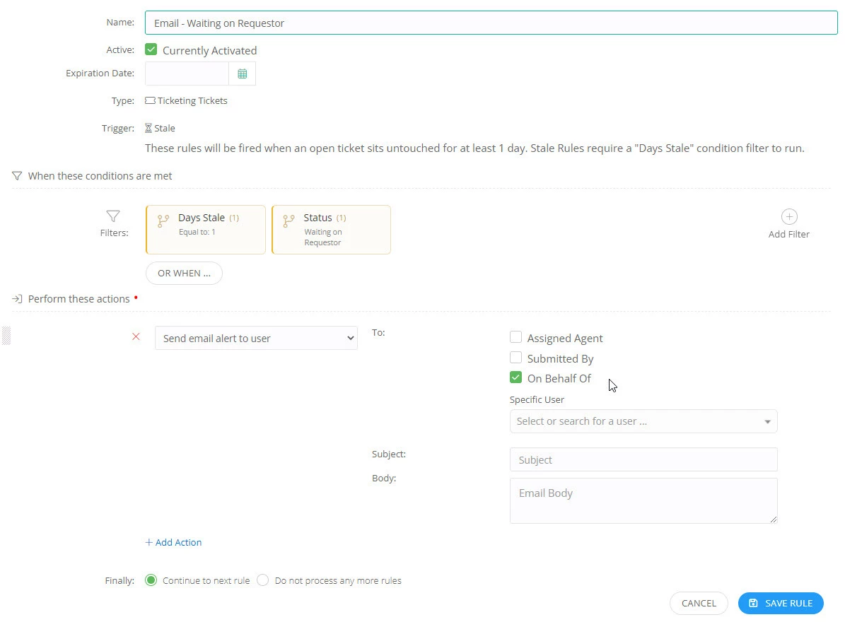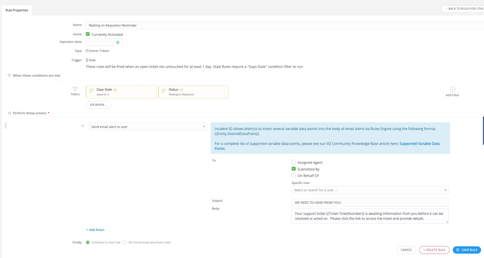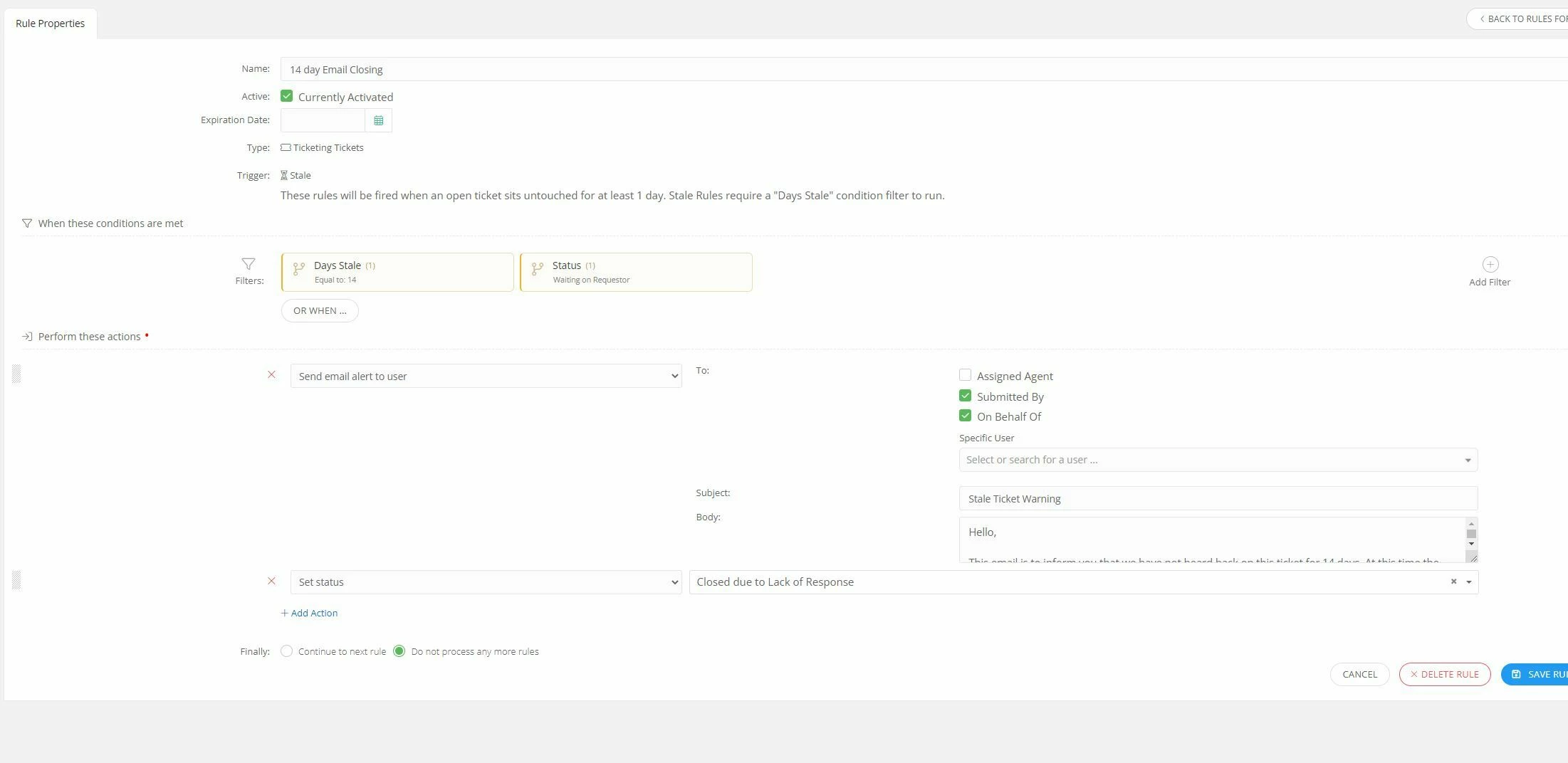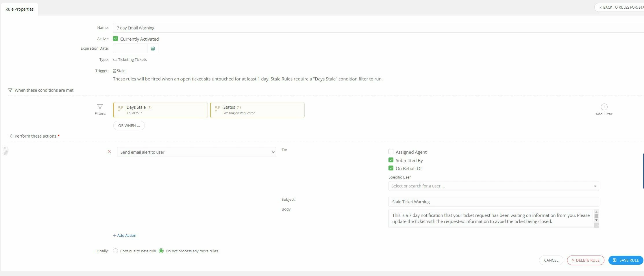 Anothe rule that we have under “when Stale” is a 3 day warning that triggers when a ticket has been in the status of waiting on requestor for 3 days.