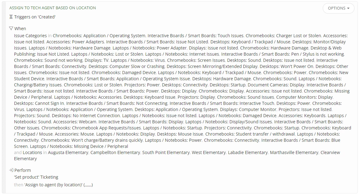 There are a lot of different things you are able to do with tickets that help the automation process. However, there are a few issues we ran into like the efficiency of selecting certain ticket types to auto assign to agent by location. We might be overlooking something simple, but it seems we have to select each Issue Category individually. Which if you have hundreds of issue categories to choose from, you can only select the first 100 or search for specific issue categories. See screen shot below of this: