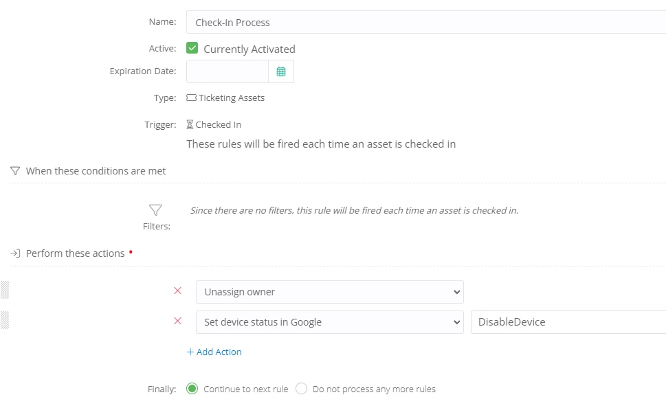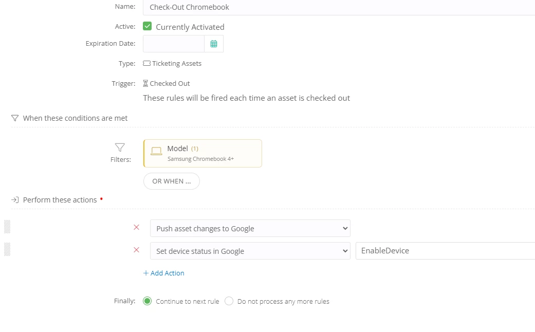 Create the rule under Assets. The trigger we use is “when ‘Checked In’”.
