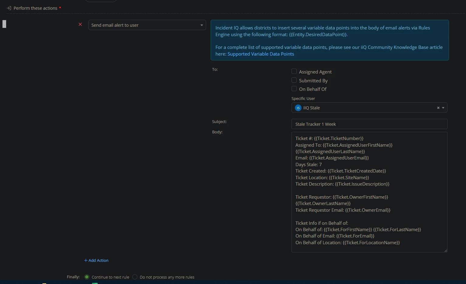 We also utilize the rules for when “From email” which allows us to customize the user experience for submitting tickets via email however we would like. For instance, we typically are sent an email by HR to change substitute roles in our SIS instead of having them submit a ticket. So we’ve set up an email similar to substitutes@ourdomain.incidentiq.com to route these emails to iiQ tickets. We just asked HR to include that email as a CC when they send them out. The only issue we’ve found is if people put more information into the subject than the body, the subject does not transfer over.