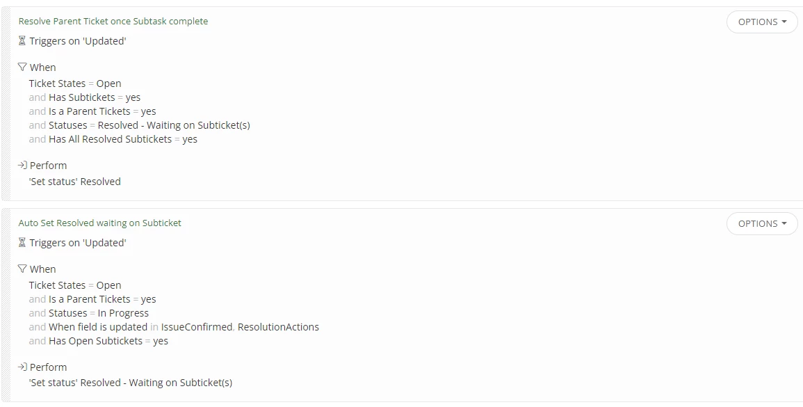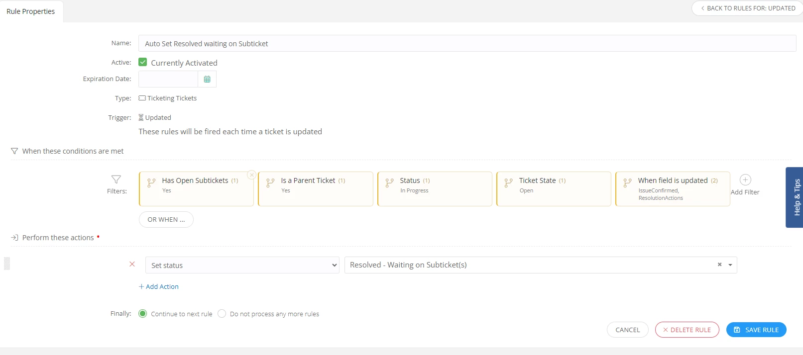 We also have set another rule for “when Updated” which will automatically update a ticket that has subtickets to have the status, Resolved - Waiting on Subticket(s) once all issues are confirmed nad resolution actions have been added.