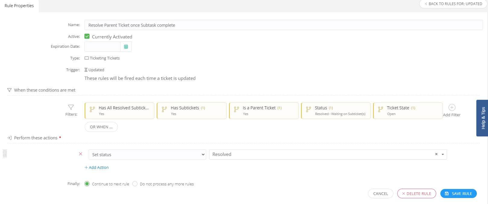 The rule to resolve a parent ticket once subtask is complete (When Updated):