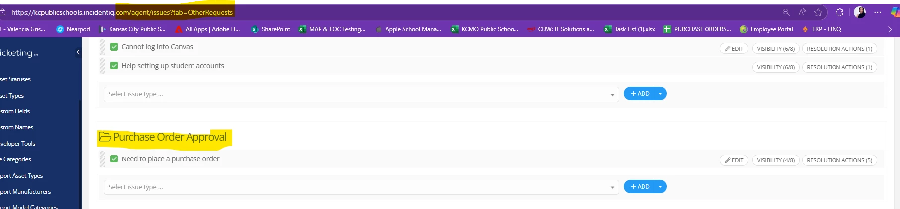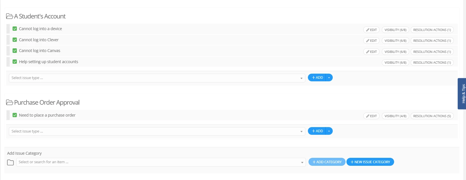 From our conversation, it sounds like you want it to show up under “I need to Make a Request.” So you will add this Issue Category and Issue Type under the Provisioning ticket bucket.
