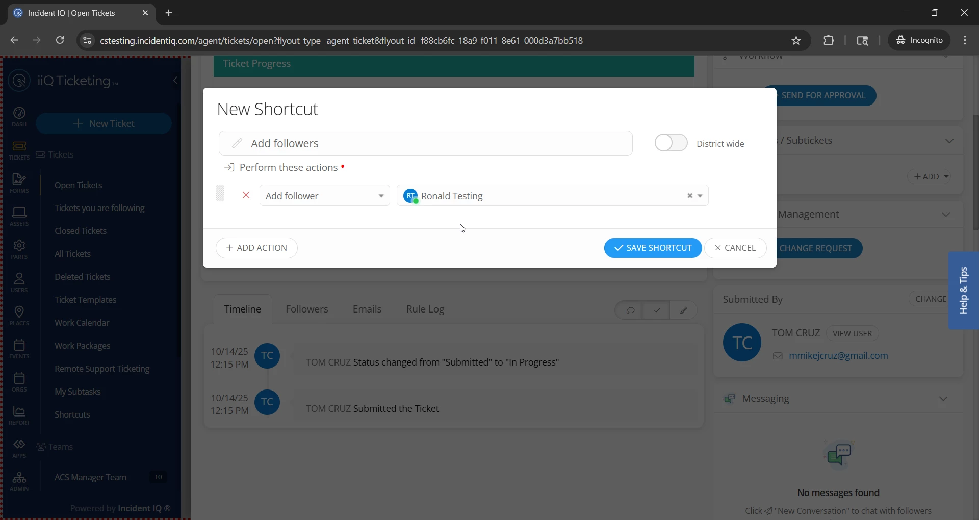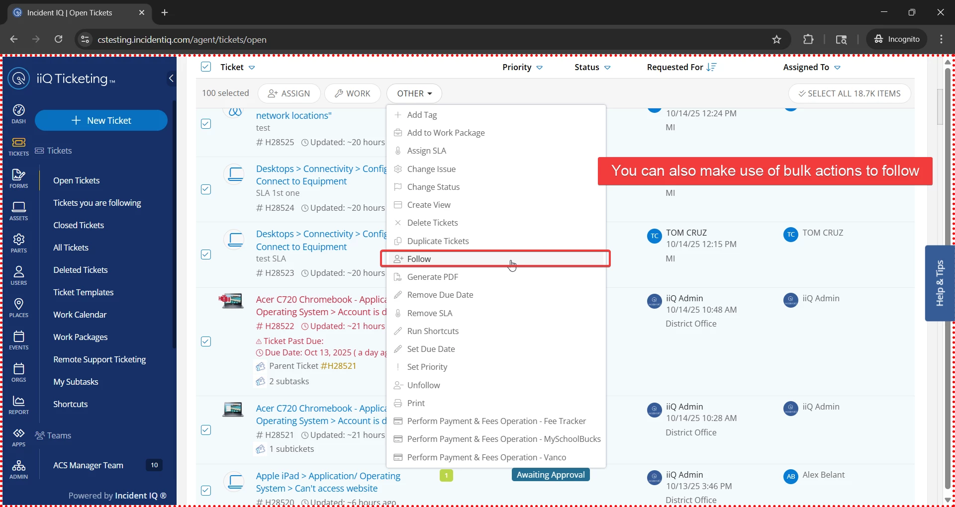 Good morning. When you are inside a ticket, you have the option to create a shortcut for adding followers. Depending on how you configure your shortcut, you can add multiple followers at once. Additionally, suppose you notice that the same user frequently follows similar types of tickets. In that case, you can create a rule to automatically add them as followers whenever those types of tickets are created. Finally, you also have the option to use bulk actions on tickets to add multiple followers at once.