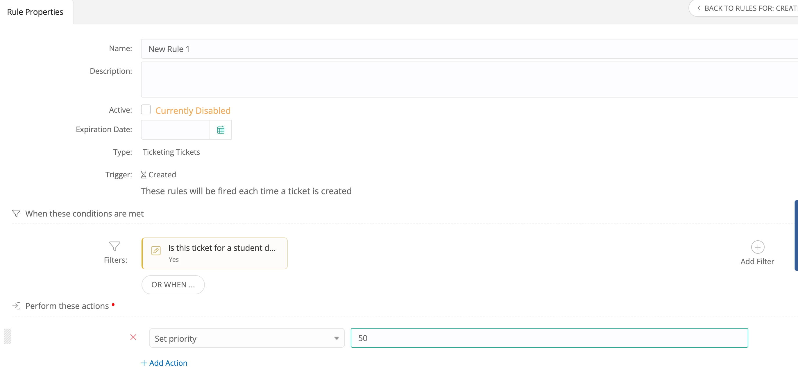 The goal is to assign a ticket with a lower priority (like 50) if the device belongs to a student.