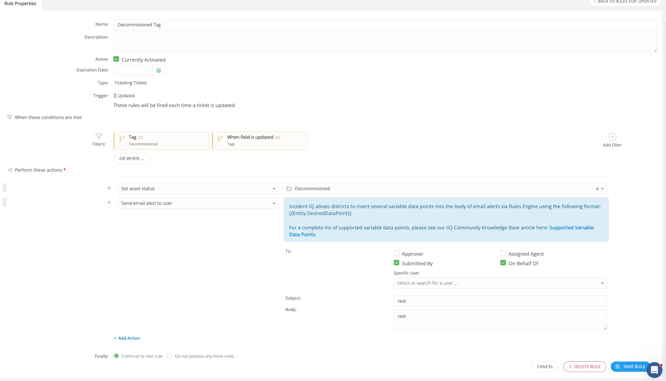 Hi there! I’m trying to create a new rule in our iiQ stack that will allow for an email to be sent to the ticket submitter or on behalf of after we change the status of a device to decommissioned. So far I have created the rule and tested it but I’m not getting anywhere with success. I have used the AI Chatbot throughouly but am at the point that I am running in circles. Below is a picture of the rule in its current state, any help is much appreciated!!