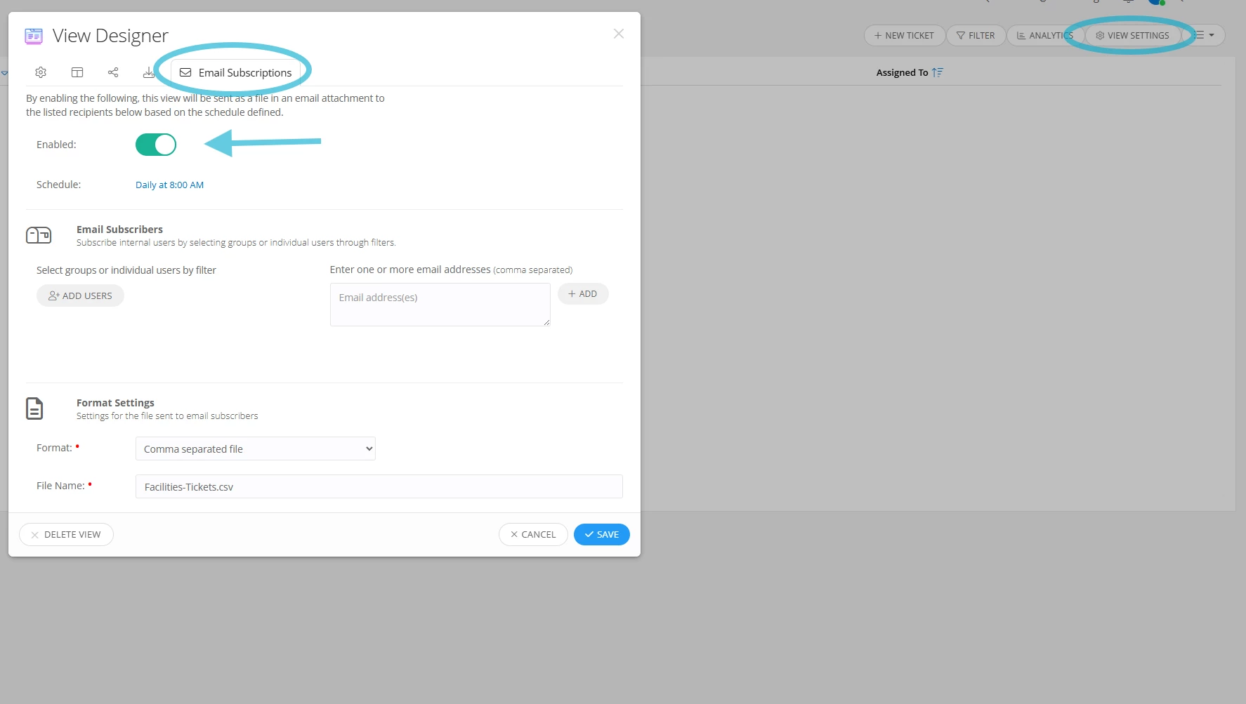 I wanted to see if there’s a way to schedule daily reports for tickets. I’ve been asked to figure out a way to give my department lead a daily report of our team’s open tickets. I know how to create the report, but I want to know if there’s a way to schedule one to be created daily and emailed. Thanks!