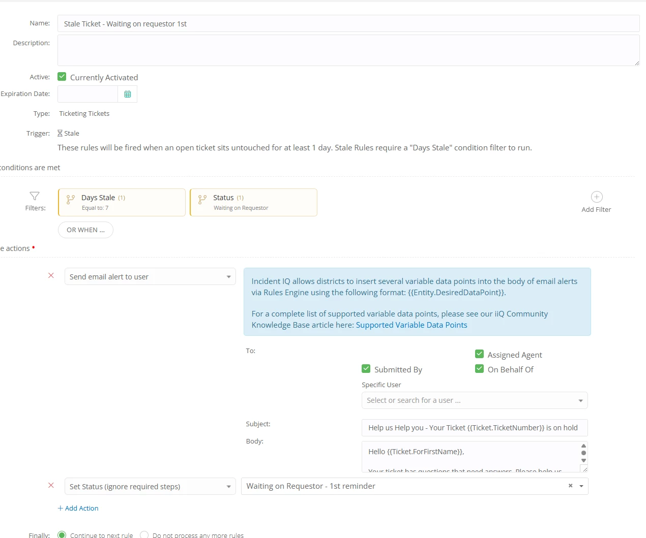 We currently have ‘Waiting on Requestor’ rules in place that send reminders to our requestors when a ticket has been sitting in that status for a specified amount of time. When each rule is triggered, it is suppose to change the status from ‘Waiting on Requestor’ to our custom reminder 1, 2, 3, etc. I understood that this rule would count how long the ticket sat at the specified status, and then trigger the next rule. However, we’re finding that the statuses aren’t changing.