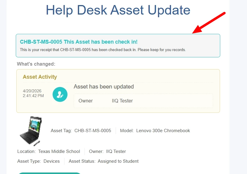 Is there a way to email a receipt to the student or parent once you check in and unassign a user from a device?  We are having issues with students stating they turned in their device but they are still assigned to it and can’t prove it one way or the other with 2900 devices in storage.  Or does anyone have a suggestion as to how to better maintain “checked in” device accuracy?