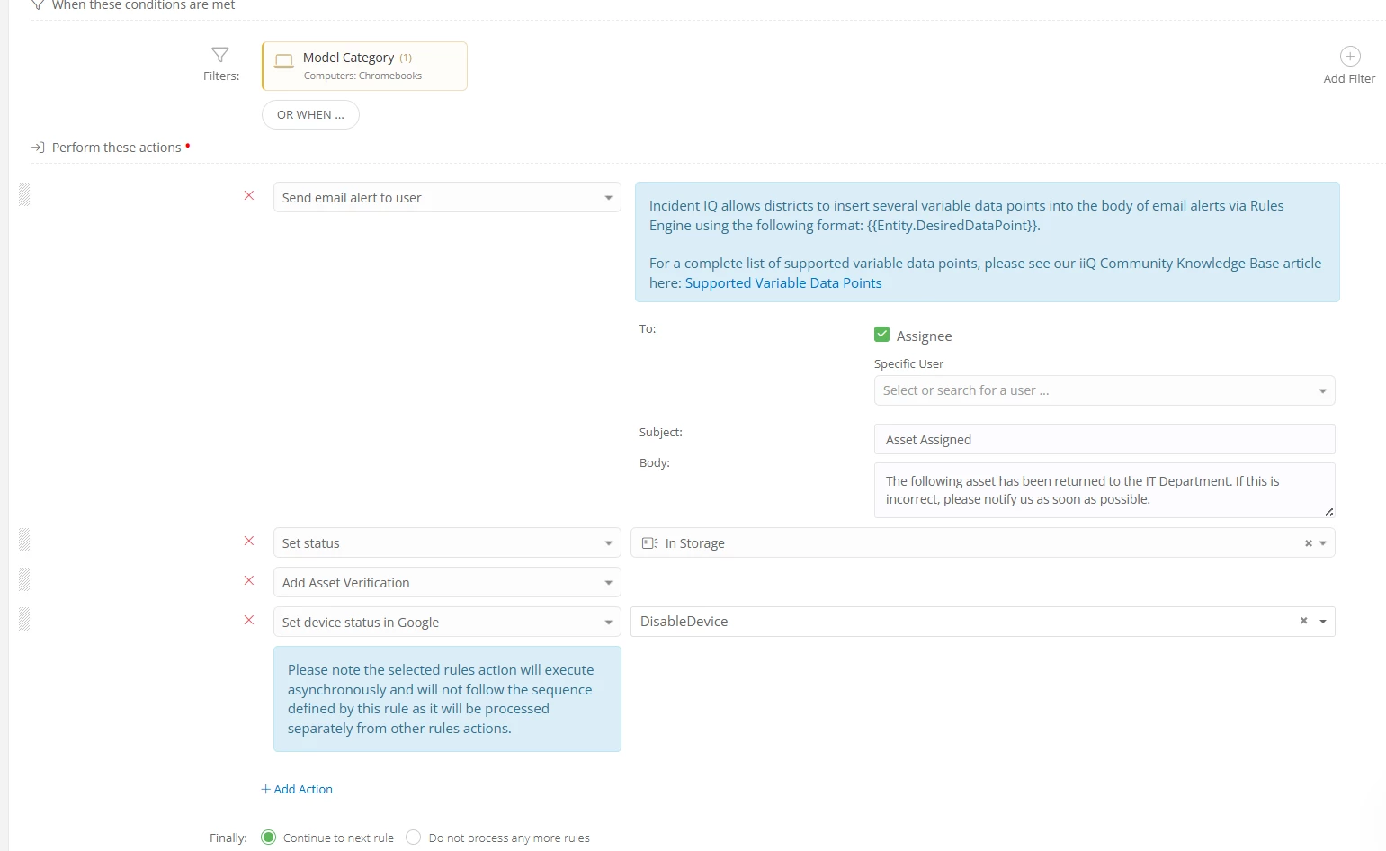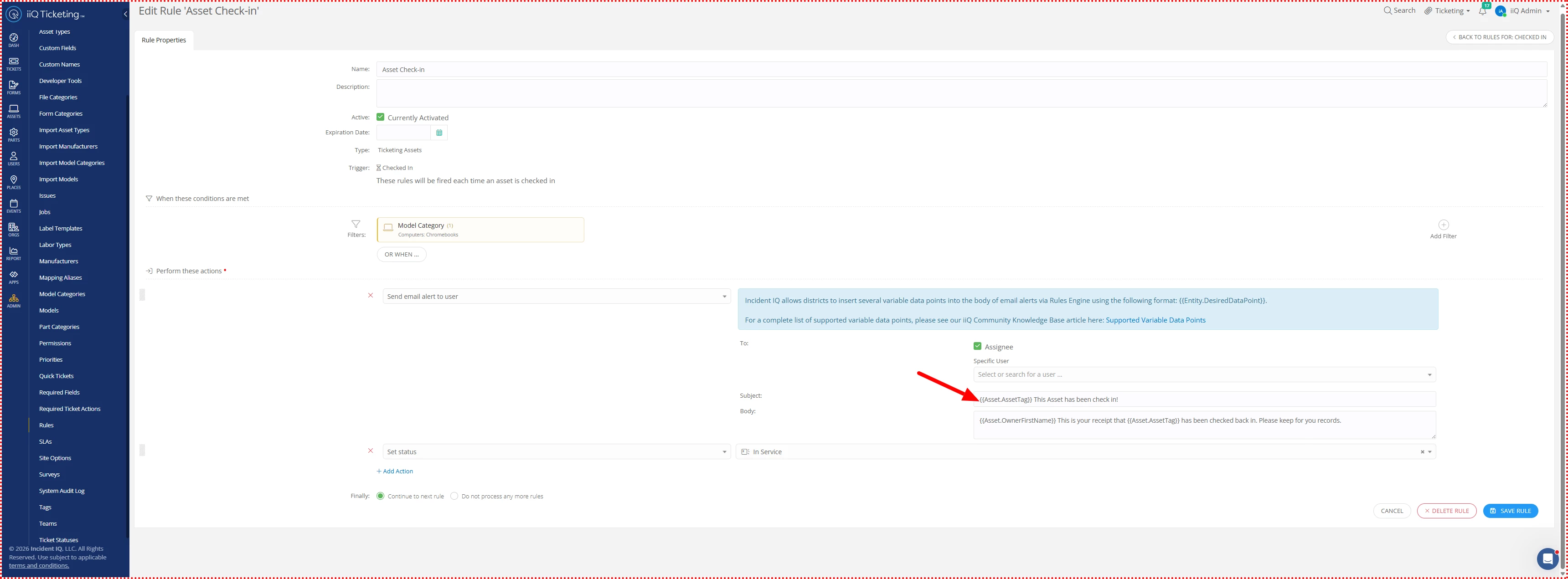 @CLane 203cf11 desotoisd  This can be found under rules> assets>when check-in as mentioned above.To take the automation a step further, you can add variables like the ones shown in the screenshot below. I’ve also included an example of the confirmation email the student will receive once their asset is successfully scanned back in.