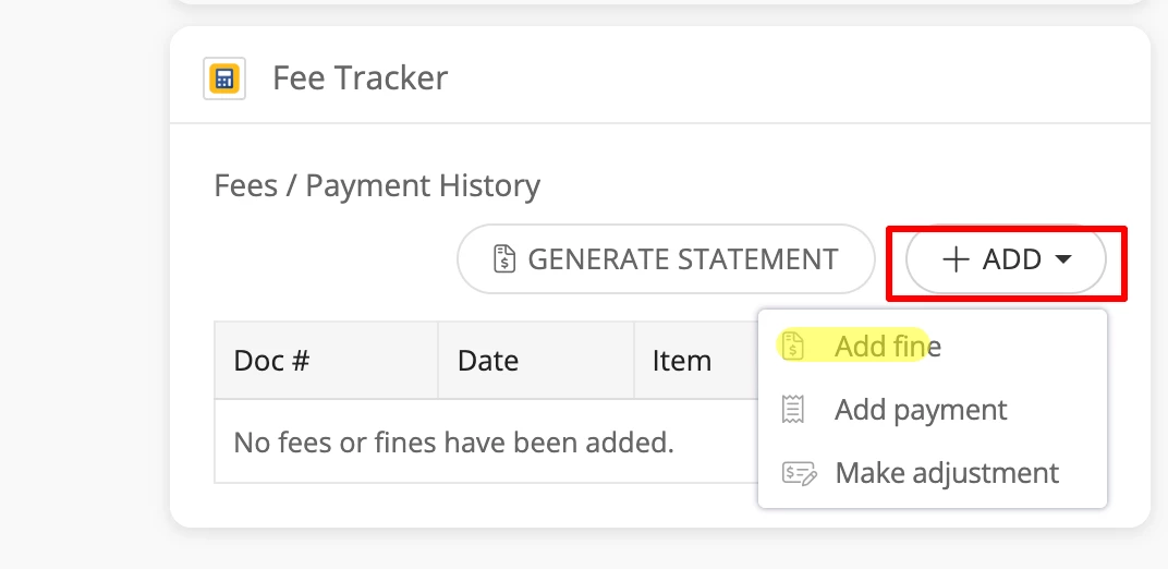I’ve set up some fees using the Fee Tracker app using the Knowledge Base article. The one thing it didn’t show was how to assign a fee. I’ve looked and can’t seem to find how to do it. I do see a section under a user but that’s to generate a statement. How do I assign a fee?